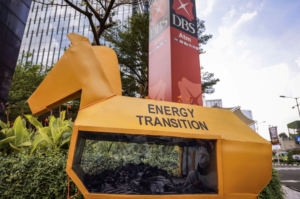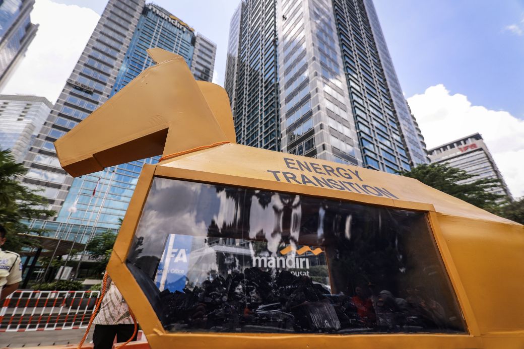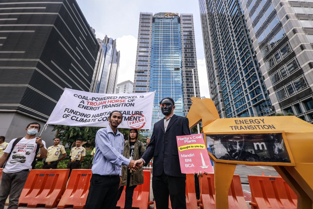 Dalam aksi ini, para aktivis menampilkan instalasi kuda troya sebagai simbol bagaimana bank menyembunyikan pendanaan batu bara di balik klaim mendukung transisi energi. Meski Nikel kerap disebut sebagai komoditas penting untuk kendaraan listrik (EV) dan energi terbarukan, smelter milik Harita di Pulau Obi justru bergantung pada PLTU captive baru berskala besar yang pada akhirnya merusak komitmen iklim global.
