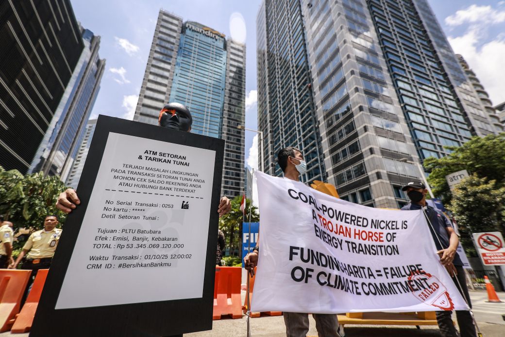 Jakarta, 1 Oktober 2025 — Sejumlah organisasi masyarakat sipil yang terdiri dari Market Forces, Enter Nusantara, JATAM, dan Trend Asia, bersama dua pendeta dari Obi menggelar aksi teatrikal di depan kantor bank-bank yang masih mendanai operasi smelter nikel milik grup Harita di Pulau Obi, Maluku Utara.